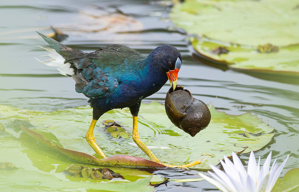 A Galinha d’água (G. galeata) é uma ave que vive em vegetações mais alagadas, como o brejo. O macho possui um escudo frontal bem avermelhado em seu bico, composto de pele sem penas, enquanto a fêmea tem seu bico totalmente exposto. No geral, sua plumagem é escura e suas pernas são longas e amareladas.