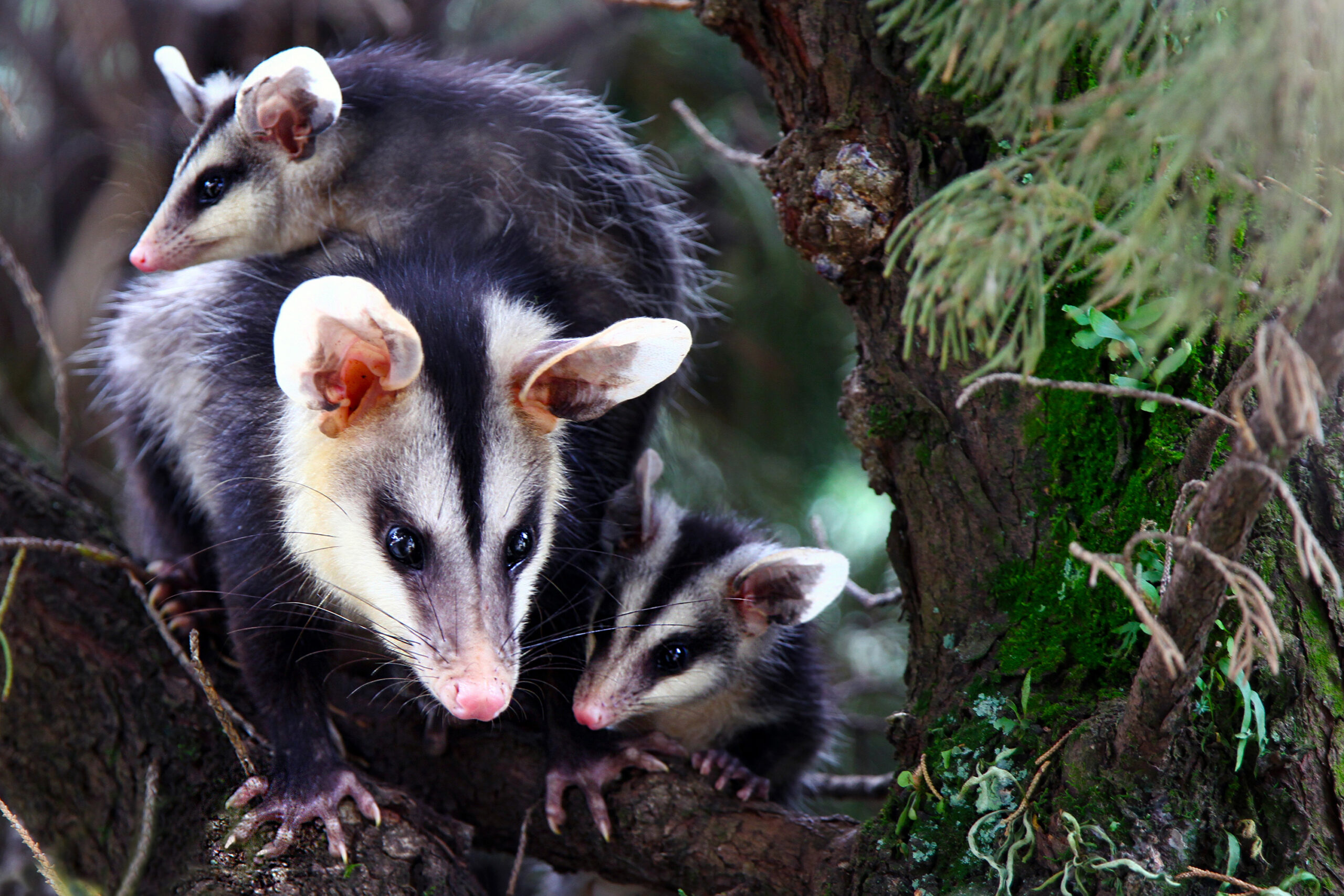 Gambá-de-orelha-branca adulto fêmea com filhotes em árvore. Disponível em: https://www.todamateria.com.br/gambas/