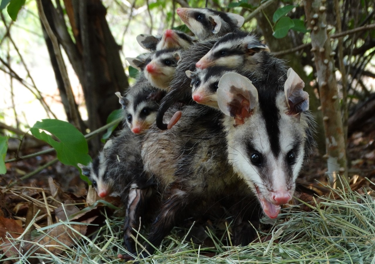 Gambá-de-orelha-branca adulto com filhotes no marsúpio. Disponível em: https://pt.wikipedia.org/wiki/Gambá-de-orelha-branca